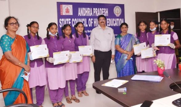 ఈ రోజు (5.8.2020) ఆంధ్రప్రదేశ్ స్టేట్ కౌన్సిల్ ఆఫ్ హయ్యర్ ఎడ్యుకేషన్ చైర్మన్ ప్రొఫెసర్ కె. హేమచంద్రా రెడ్డి గారి ద్వారా సర్టిఫికెట్లు అందుకున్న రాష్ట్ర స్థాయి వ్యాస రచన పోటీలో విజేతలైన మన 'విద్యాలయ' విద్యార్థినులు